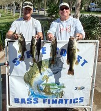 The Space Coast Bass Finatics 9th Tournament was held May 19th at Lake Eustis, Tavares Fl. Buzzard Beach ramp seemed like the place to be as 5 different clubs were at the ramp. Thankfully everything went smoothly, and we were able to take-off right at safe light. The Club Officers held a vote prior to launch to change the weigh-in time to 3:30 instead of the usual 3pm. This helped cut out some congestion in the afternoon, a great decision! The water temperature ranged from 81 in the morning to 85 in the afternoon.