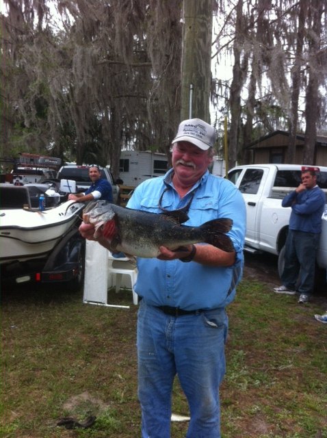 Mike Hampton with a 7.40 pounder that was the kicker of the Hampton/Kopf tournament winning 21.46 pound bag. This fish was big bass of the tournament and season for a few minutes before I hauled a 9.90 to the scales. Unfortunately, as you may have noticed, the fish is a little stiff and ended up being someone's dinner. (Photo by Alan Elder)