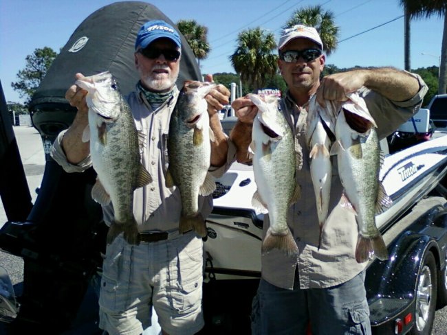 Mike Calloway (left) and Cliff Semonski (right) with 20.44 pounds they hauled out of the Harris Chain. The biggest was a 5.69 but they all seem to be in the 4 pound range. They reported catching them on Okeechobee Craw colored Zoom UV Speed Craws and Yum Dingers in Lake Dora.