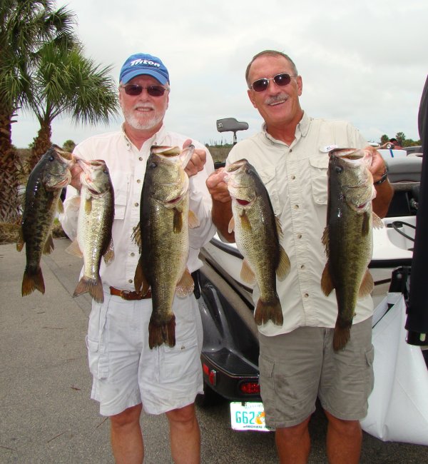 Mike Calloway (left) and David Moore (right) with 21.50 pounds of Okeechobee bass they caught. They reported catching them on zoom uv speed worms and rat-l-traps. (Photo by Jay Martin)