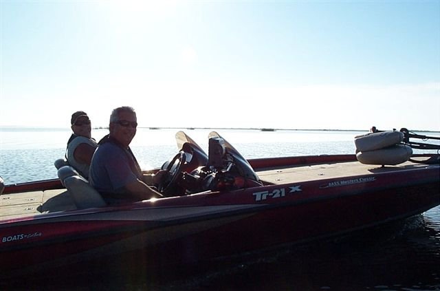 Those smiling faces belong to Alan Elder in the foreground and Wayne Smith in the passenger seat somewhere on the vast Lake Okeechobee. (photo by Tim Kopf)