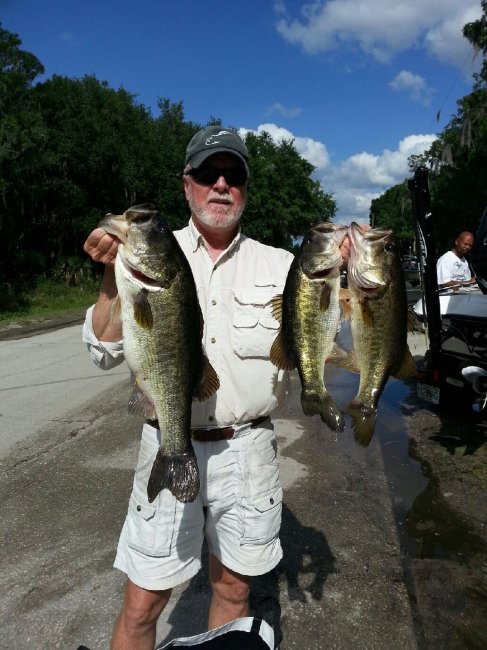 Mike Calloway presents the 3 biggest he and Cliff Semonski caught on Lake Kissimmee flipping Yum Dingers at the April 28, 2013 tournament out of Lake Cypress. The one in his right hand was 7.92 pounds and the other two look to be in the 3-4 pound class. (Photo by Alan Elder)