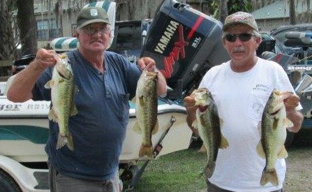 You're looking at Bob Barnette (left) and Dwayne Haga (right) with 15.05 pounds of bass they caught in Lake Toho on Yamamoto Senkos. Their bag of the same looking 3 pounders was good enough for 3rd place at our February 23, 2014 tournament out of Lake Cypress. (Photo by Tim Kopf)