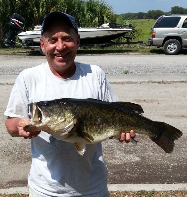 That's Tim Iler with a huge 10.47 pounder he caught on a jerkbait in Lake Kissimmee on April 27, 2014. Tim casted out his jerkbait and then took a few minutes to stretch a sore muscle in his neck and back leaving his bait motionless for several minutes. Refocusing on fishing, he thought he was hung up in the grass until it started moving. A long fight ensued with the fish busting the surface a few times and going into some heavy grass. Eventually, the fish ran out of energy and Tim was able to get it near enough for his partner, Larry Cruce, to scoop the fish with the net. (Photo by Mike Calloway)