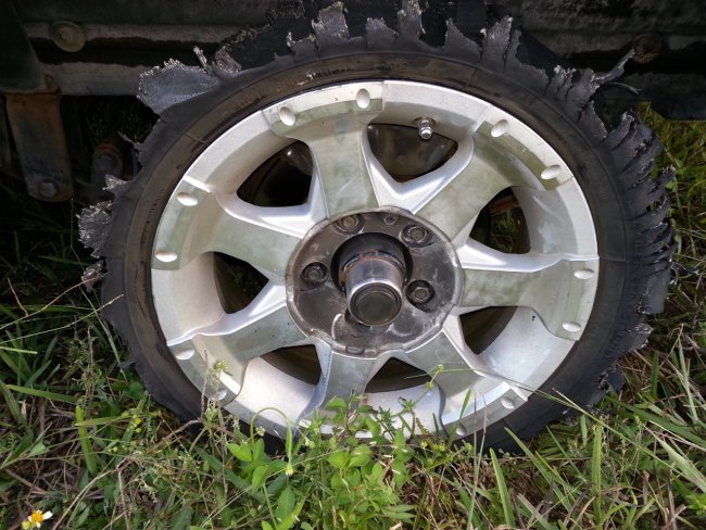 To make matters worse, the lug nut in the upper right of this photo rounded causing him to be unable to change the tire with his spare. Mike was waiting for his Progressive insurance provided tow truck to show up for about 5 hours before calling a local towing company out of St Cloud recommended by a sheriff that stopped to assist. That company showed up in less than a half hour and Mike was finally on his way home around 9:30pm.