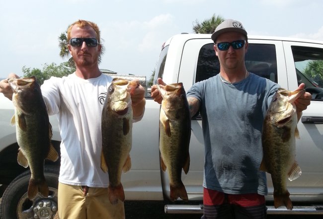 Jake (left) and Gary Hinman show the best 4 of their tournament winning 21.35 pound limit at Lake Kissimmee on April 26, 2015. (Photo by Mike Calloway)