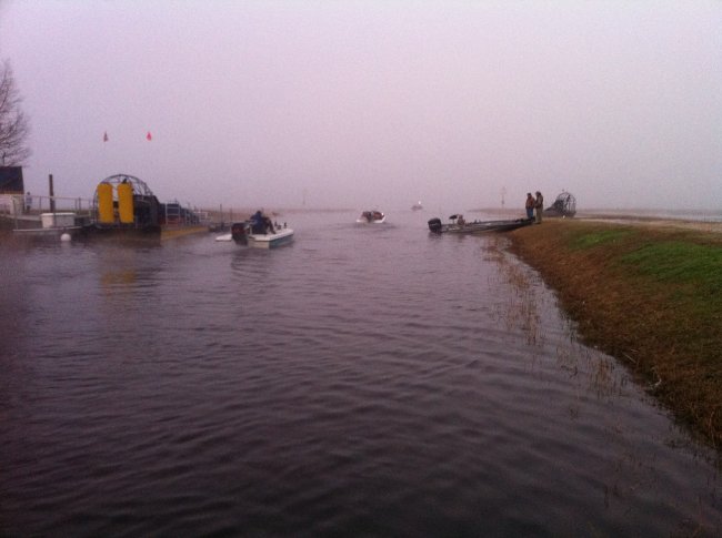 This photograph shows the foggy scene at the ramp as the January 30, 2011 tournament at Lake Cypress started. The whole lake was covered in dense fog. The tournament started slowly as visibility was reduced to about 100 feet on the water. Teams idled to their fishing holes not far from the ramp. The fog slowly lifted from east to west across the lake. It took until after 10 am for the fog to completely dissipate. (Photo by Aaron Wiginton)